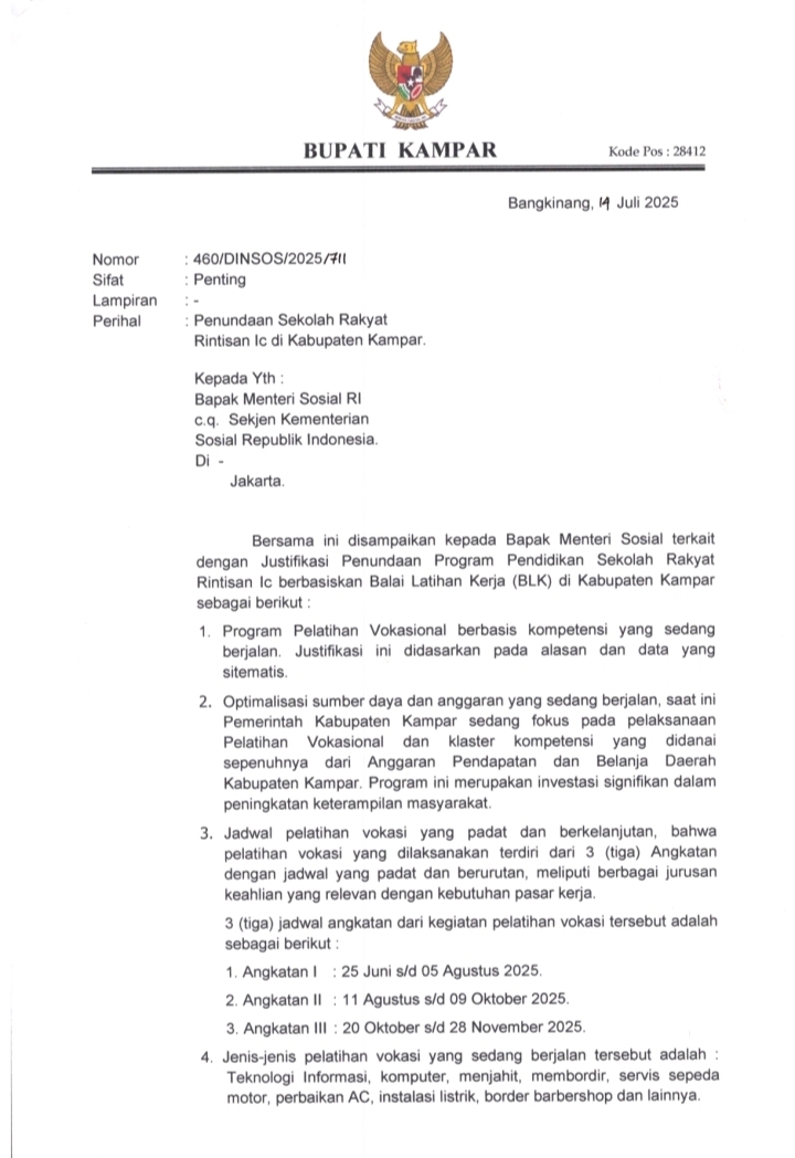 “Pemkab juga menyatakan tetap mendukung pembangunan Sekolah Rakyat Reguler karena lahan seluas 7 hektare telah tersedia,” bunyi surat yang ditandatangani Wakil Bupati Kabupaten Kampar Misharti.