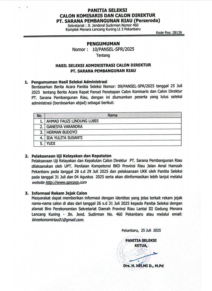Dimana sebelumnya, Pemerintah Provinsi Riau akan memproses pergantian Direktur Utama PT. Sarana Pembangunan Riau (SPR) melalui Rapat Umum Pemegang Saham Luar Biasa (RUPS-LB) yang dijadwalkan dilaksanakan besok pagi, Jumat (23/1/2026). Pergantian ini dilakukan karena dinilai tidak memenuhi persyaratan jabatan.
