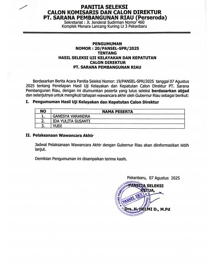 Saat ini, jabatan Direktur Utama PT. SPR dipegang oleh Ida Yulita Susanti, yang ditunjuk oleh Gubernur Riau nonaktif Abdul Wahid pada Agustus 2025. Usulan pencopotan telah diajukan oleh Plt Gubernur Riau SF Hariyanto sejak Desember 2025 lalu dan baru akan difinalisasi dalam RUPS LB besok pagi.***