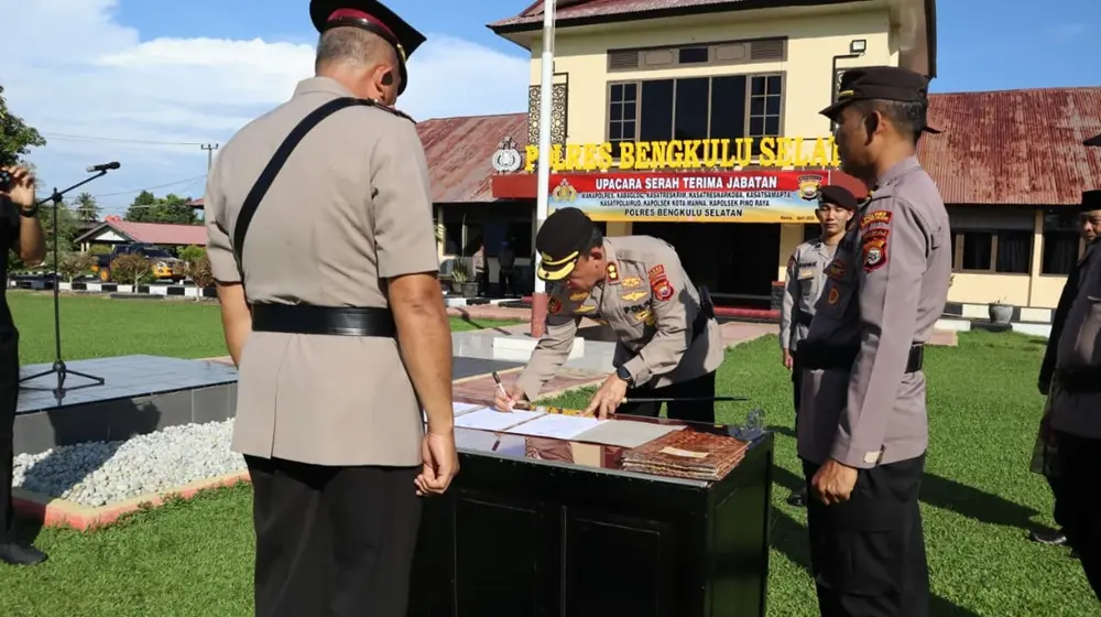 MANNA, AmiraRiau.com – Kepolisian Resor (Polres) Bengkulu Selatan melaksanakan upacara serah terima jabatan (sertijab) bagi sejumlah pejabat utama (PJU) dan Kapolsek jajaran, Kamis (16/4/2026). Upacara yang berlangsung khidmat di lapangan apel Polres ini dipimpin langsung oleh Kapolres Bengkulu Selatan, AKBP Awilzan.